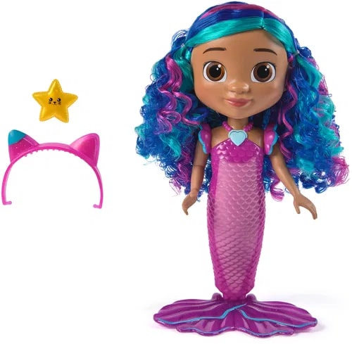 Panenka Mořská víla Gábina z filmu Gábinin kouzelný domek představuje detailně propracovanou figurku s výraznými barvami a hravým designem. Panenka měří přes 35 cm a je oblečena v růžovofialovém oblečku s texturou rybí šupiny, která má na ocase průhledný fialový lem s modrými akcenty. Její vlasy jsou vlnité a barevně laděné do odstínů modré a fialové s růžovými pramínky, což jí dodává živý a kouzelný vzhled. Gábina má velké hnědé oči a přívětivý výraz, doplněný růžovou čelenkou s kočičími ušima a malou hvězdicí, kterou může držet v ruce nebo připnout do vlasů jako doplněk.