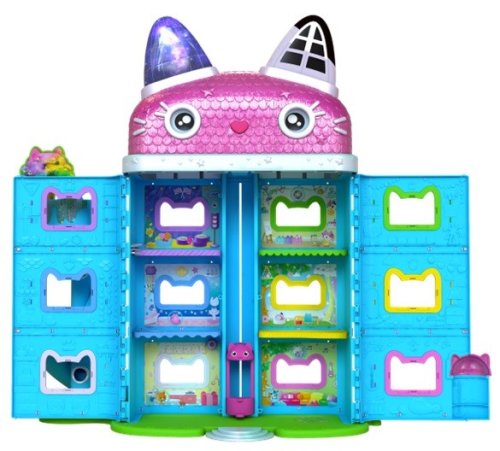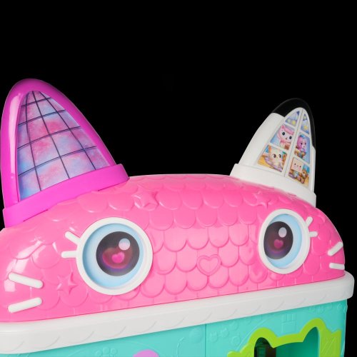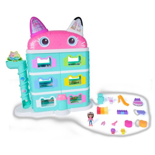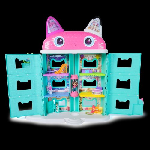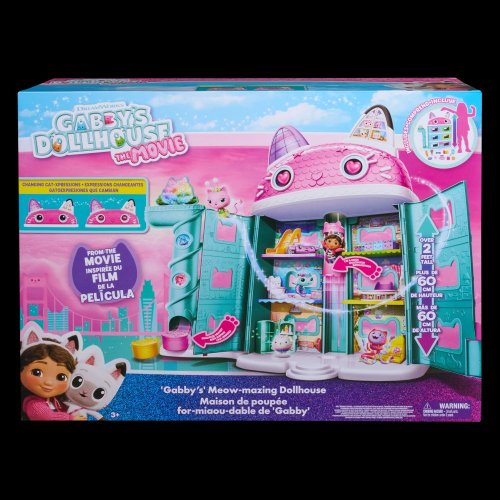 Přineste si domů kouzlo filmu Gábinin kouzelný domek! Tento úžasný domeček pro panenky měří přes 60 cm na výšku a má lentikulární oči, které přidávají na napínavém hraní! Užijte si plnohodnotnou 360° hru v 7 místnostech a herních zónách s kočičí tematikou. Objevujte domeček pomocí kočičího výtahu a posílejte zásilky doručovací věží! Tato sada domečku pro panenky obsahuje 9cm figurku Gábiny oblečenou stejně jako ve filmu Gábinin kouzelný domek, včetně její charakteristické čelenky s kočičíma ušima – ideální pro úžasné objevování s těmito vzdělávacími hračkami. Rozbalte doručený balíček z domečku stejně jako Gábina a objevte doplňky k domečku pro panenky – poté naskenujte QR kód a odemkněte bonus v aplikaci Gábinin kouzelný domek. Tato sada je skvělým způsobem, jak podnítit představivost a vybídnout děti k mňau-úžasným objevům s těmito roztomilými kočičími hračkami ze světa Gábiny. Hračky z Gábinina kouzelného domku jsou jako stvořené pro děti, které si chtějí znovu prožít oblíbené chvíle z filmu o Gábině, nebo si vytvářet nová dobrodružství v jejím kouzelném domečku. Najdete tu hračky pro nejmenší – od doplňků do domečku a nábytku až po její mňau-skvělé kočičí kamarády a úžasné mořské víly. Každá hračka (prodávaná samostatně) nabízí hodiny a hodiny úžasné zábavy