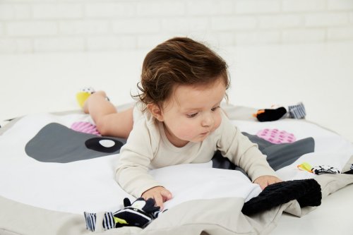 uprostřed uší je všitý šustivý materiál, který stimuluje sluch miminka uši pandy může dítě může uchopit, mačkat a zvedat a přitom si procvičovat úchop a jemnou motoriku podložka na svých koncích má smyčky, které vám umožňují připevnit další hračky GaGaGu a vytvořit si hračku na míru další prvky připevněné k podložce povzbuzují dítě k nácviku plazení a uchopování vzdálených prvků podložka je měkká a poměrně hustá, což ochrání miminko před chladem a tvrdou zemí. žádné plastové díly lze kombinovat s dalšími produkty GaGaGu