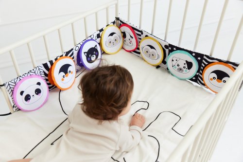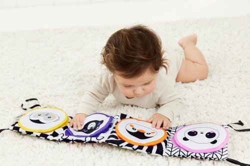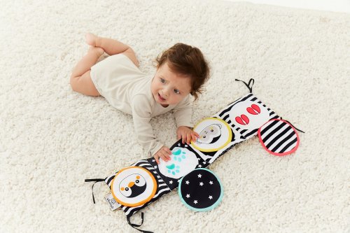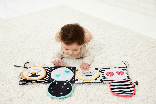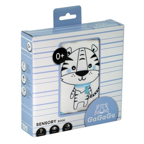 Na literární klasiku bude ještě čas, ale pokud vašeho malého miláčka přitahují knihy od samého začátku, nesmí mu po ruce chybět smyslová knížečka s obrázky zvířat a jejich oblíbených jídel. Kniha GaGaGu má kontrastní barvy a vzory, což stimuluje zrak dítěte. Kniha je oboustranná. Na jedné straně jsou kontrastní ilustrace zvířat s vyšívanými prvky, které jsou pro dítě pod prsty znatelně odlišné textury – stimulace hmatu, učení se různým texturám dítětem. Na druhou stranu jsou tu kulaté plyšové žabky, které dítěti umožní hrát jednu z oblíbených „her“ miminka – a kuku! – každá chlopeň je potištěna na obou stranách jiným vzorem – jeden prvek, ale dva zcela odlišné vizuální zážitky. Pod plyšovými žabkami s obrázky zvířátek jsou symboly jídla, co zvířátko jí + plyšové klapky mají všitý šustivý materiál a při otevírání a doteku šustí – menší dítě se učí různé tvary a barvy a dostává sluchovou stimulaci, starší dítě se dozví, jakou potravu dané zvíře jí. Věk 0+