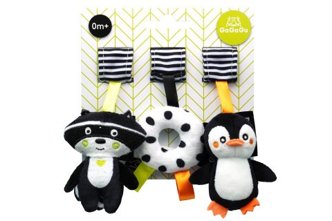 Génius je ten, kdo vidí víc než ostatní. Pokud tedy budete zrak svého dítěte od samého počátku správně stimulovat…. kdo ví, co všechno bude schopné rozpoznat! Pro začátek budou vhodné závěsný plyšový Mýval, Tučňák a Donut.Závěsná plyšová hračka GaGaGu má kontrastní barvy a vzory, které stimulují zrak dítěte. Plyšové prvky – opice, panda a míč – a stuhy vybízejí děti, aby je uchopily a podpořily tzv. jemnou motoriku (pohyby prstů a rukou) a učení motorické koordinace. Pohodlný způsob zapínání na suchý zip (příjemný na dotek a snadné zapínání) vám umožní přívěsek připevnit kamkoli, například na kočárek, na postýlku, na houpačku nebo autosedačku. Věk 0+