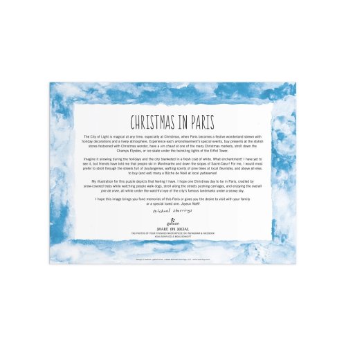 Fóliové puzzle od Michaela Storringse zobrazuje radost z Vánoc v ulicích Paříže. Toto puzzle je tou správnou výzvou pro celou rodinu. Části motivu mají speciální povrch, který se na světle z různých úhlů kovově leskne a vytváří tak dojem, že je puzzle ze zlata, stříbra a dalších lesklých kovů. Milovníci puzzle jistě ocení všechny zajímavé detaily, které po složení vytvářejí krásný obraz, který dodá nádech elegance každé místnosti nejen v době Vánoc. Ať už hledáte zábavnou aktivitu pro deštivý den nebo jedinečný dárek pro milovanou osobu, toto puzzle určitě udělá dojem. Díky svým složitým detailům a náročnému designu je toto puzzle ideální pro každého a z puzzle činí krásný a poutavý doplněk do každého domova nebo kanceláře. Hlavní vlastnosti: vyroben odpovědně z materiálu s certifikací FSCpotištěno netoxickými inkousty1000 precizně vyřezaných dílků obsahuje návodný obrázek Značka a certifikát FSC® (Forest Stewardship Council) zaručuje, že dřevo, ze kterého byl produkt vyroben, nebylo vytěženo nelegálně a pochází z lesů obhospodařovaných šetrným či přírodě blízkým způsobem, ve kterém jsou dodržovány přísné environmentální a sociální požadavky. Značka FSC® na výrobku znamená, že svým nákupem pomáháte chránit lesy a podporujete šetrné, odpovědné či přírodě blízké hospodaření, díky kterému jsou naše lesy stabilnější, zdravější, mají přirozenou druhovou skladbu a lépe odolávají negativním následkům klimatických změn.