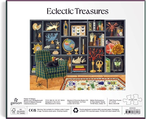 Metalické puzzle má speciální povrch, který se na světle z různých úhlů kovově leskne a vytváří tak dojem, že je puzzle ze zlata, stříbra a dalších lesklých kovů. Rozměr složeného puzzle cca 69 x 51 cm