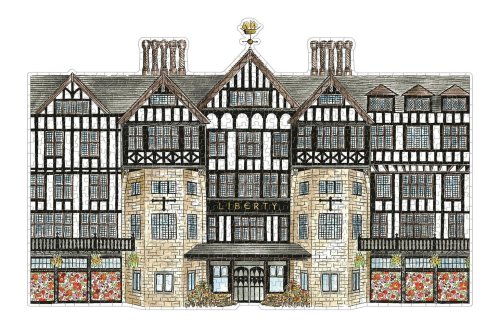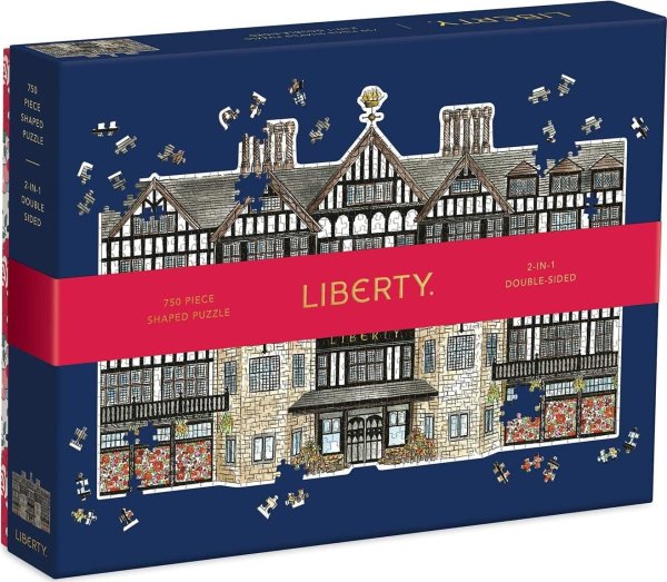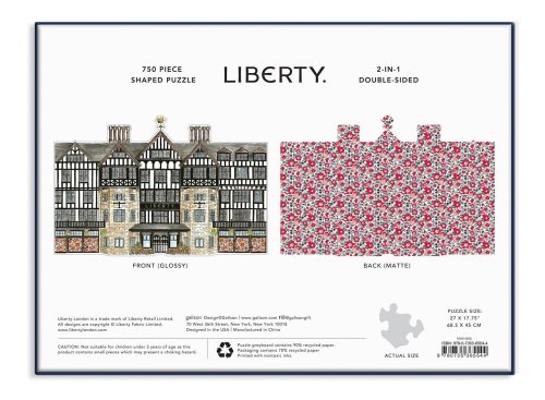 Tvarované puzzle Liberty London Tudor Building 750 dílků od Galison má na jedné straně charakteristickou budovu Tudor a na druhé straně květinový vzor. Designové puzzle se slavnými uměleckými díly designéra Liberty Londona .
