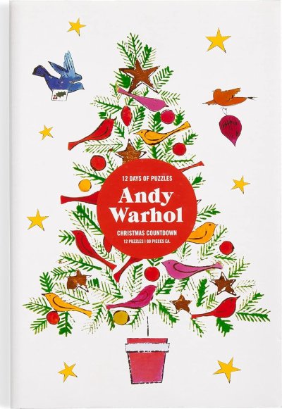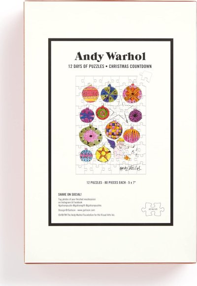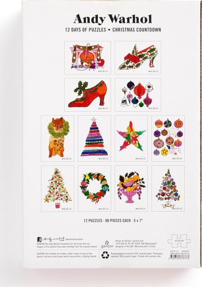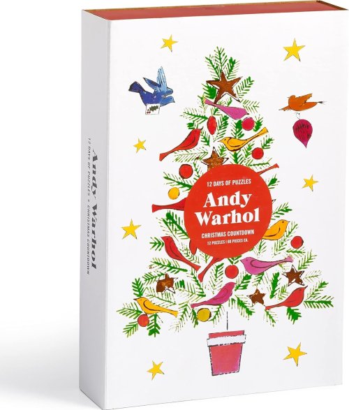 12ti denní Adventní kalendář obsahuje 12 balení puzzle s Warholovými rozmarnými vánočními obrazy, kresbami a grafikami z 50. let. Po sejmutí vnějšího obalu se objeví předlohy a samotný adventní kalendář s 12 tradičními okýnky . Každý den otevřete jedno, poskládáte puzzle a Vánoce jsou tady. Součástí balení je oboustranná předloha se 12 motivy puzzle. Puzzle Andyho Warhola jsou ideálním dárkem pro milovníky puzzle i výtvarného umění. Rozměr složeného puzzle cca 12,7 x 17,8 cm