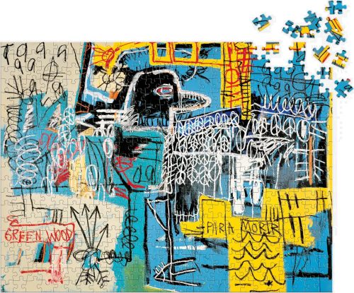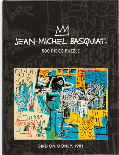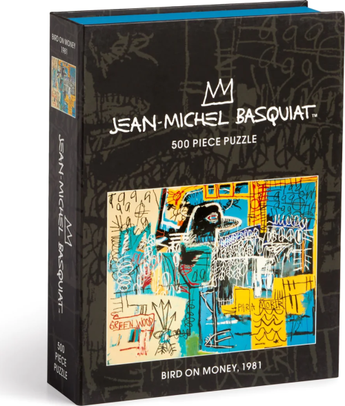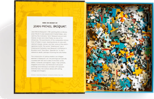 Puzzle Basquiat: Zámožný pták v obalu ve tvaru knihy je obměnou klasického 500 dílného puzzle.