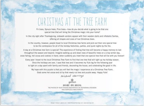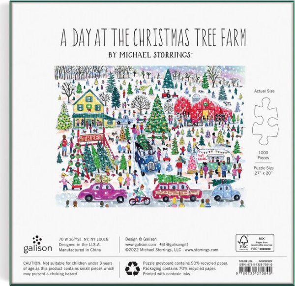 Vánoční shon může znamenat i radost a veselí, zvláště když jde o vánoční stromeček! Vydejte se prostřednictvím puzzle na farmu se stromky, hýřící barvami a očekáváním. Připomínejte si sváteční náladu a příležitost k setkáním s milovanou rodinou a přáteli! Autorem obrázku je cenami ověnčený designér a ilustrátor Michael Storrings. Puzzle Galison jsou vyrobeny za použití významného podílu recyklovaného papíru a nabízí špičkový potisk nezávadnými barvami. Jsou opatřeny matnou povrchovou úpravou, která zajišťuje za všech okolností věrné podání detailů i barev. Jejich zadní strana je potažena hladkým, na dotek příjemným povrchem, díky němuž se při skladování rozloženého puzzle netvoří prach. Spolu s pečlivě zabalenými dílky naleznete v balení také letáček s návodným obrázkem, který zpravidla obsahuje další informace o tvůrcích a pozadí vzniku díla. Dodáváno v mimořádně pevné a poutavě zpracované kartonové krabičce vyrobené z recyklovaného kartonu a udržitelně získaných materiálů s certifikací FSC®. Hlavní vlastnosti:1000 precizně vyřezaných dílkůvyrobeno s použitím recyklovaných a udržitelně získaných materiálůpečlivě vybraný motiv od renomovaných tvůrců a umělcůpotisk a provedení nejvyšší kvalityobsahuje návodný obrázek