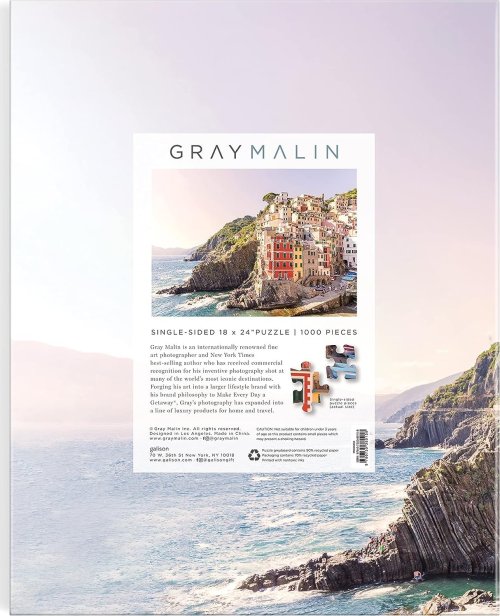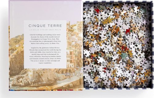 Puzzle Gray Malin: Cinque Terre v obalu ve tvaru knihy je obměnou klasického 1000 dílného puzzle.