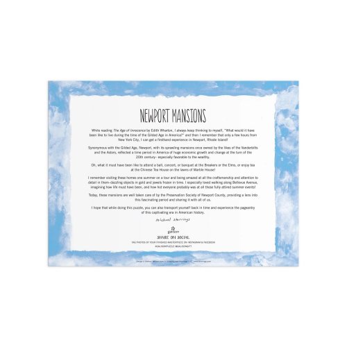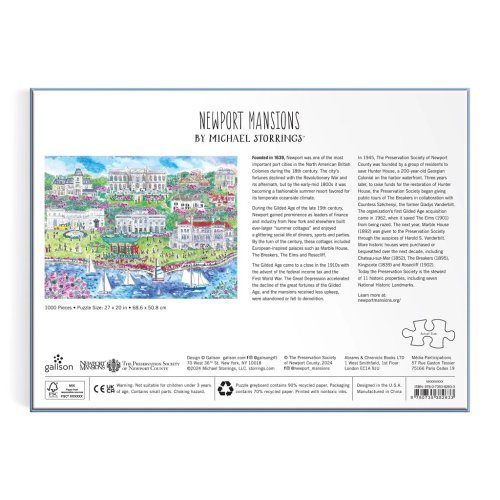 Puzzle od Michaela Storringa představuje rozlehlá sídla v Newportu na Rhode Islandu, která byla postavena během zlatého věku. Toto puzzle je tou správnou výzvou pro celou rodinu. Milovníci puzzle jistě ocení všechny zajímavé detaily, které po složení vytvářejí krásný obraz, který dodá punc elegance každé místnosti. Ať už hledáte zábavnou aktivitu pro deštivý den nebo jedinečný dárek pro milovanou osobu, toto puzzle určitě udělá dojem. Je vhodné pro každého, kdo miluje historii a architekturu. Vysoce kvalitní umělecká díla těchto slavných sídel na Rhode Islandu z puzzle činí krásný a poutavý doplněk do každého domova nebo kanceláře. Hlavní vlastnosti: vyroben odpovědně z materiálu s certifikací FSCpotištěno netoxickými inkousty1000 precizně vyřezaných dílků obsahuje návodný obrázek Značka a certifikát FSC® (Forest Stewardship Council) zaručuje, že dřevo, ze kterého byl produkt vyroben, nebylo vytěženo nelegálně a pochází z lesů obhospodařovaných šetrným či přírodě blízkým způsobem, ve kterém jsou dodržovány přísné environmentální a sociální požadavky. Značka FSC® na výrobku znamená, že svým nákupem pomáháte chránit lesy a podporujete šetrné, odpovědné či přírodě blízké hospodaření, díky kterému jsou naše lesy stabilnější, zdravější, mají přirozenou druhovou skladbu a lépe odolávají negativním následkům klimatických změn.
