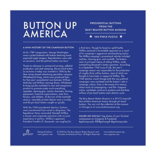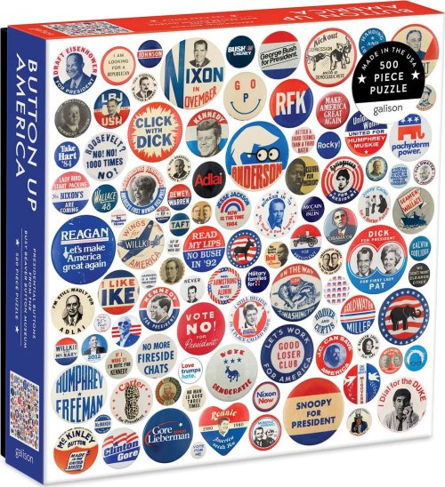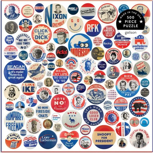 500 dílné rodinné puzzle zobrazuje fotografii placek politické kampaně z americké historie. Puzzle je baleno v pevných krabicích s matným povrchem. Umělec Busy Beaver Button MuseumÊ. Hlavní vlastnosti: Obsahuje 500 dílkůPotištěno netoxickými inkoustyPrémiová kvalita puzzleJednotlivé dílky do sebe přesně pasujíRozvíjí logické myšlení a motoriku