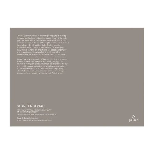Portobello Road je oblíbené místo fotografa Jamese Ogilvyho. Složené puzzle zobrazuje výstřednost této jedinečné londýnské ulice s dlouhou historií trhů a malých neobvyklých obchodů. Puzzle je baleno v pevné krabici, pro opětovné použití a skladování. Ideální jako dárek. Autorem obrázku je James Ogilvy. Puzzle jsou vyrobeny za použití významného podílu recyklovaného papíru a nabízí špičkový potisk nezávadnými barvami. Jsou opatřeny matnou povrchovou úpravou, která zajišťuje za všech okolností věrné podání detailů i barev. Jejich zadní strana je potažena hladkým, na dotek příjemným povrchem, díky němuž se při skladování rozloženého puzzle netvoří prach. Spolu s pečlivě zabalenými dílky naleznete v balení také letáček s návodným obrázkem, který zpravidla obsahuje další informace o tvůrcích a pozadí vzniku díla. Dodáváno v mimořádně pevné a poutavě zpracované kartonové krabičce vyrobené z recyklovaného kartonu. Hlavní vlastnosti: 1000 precizně vyřezaných dílkůvyrobeno s použitím recyklovaných a udržitelně získaných materiálůpečlivě vybraný motiv od renomovaných tvůrců a umělcůpotisk a provedení nejvyšší kvalityobsahuje návodný obrázek