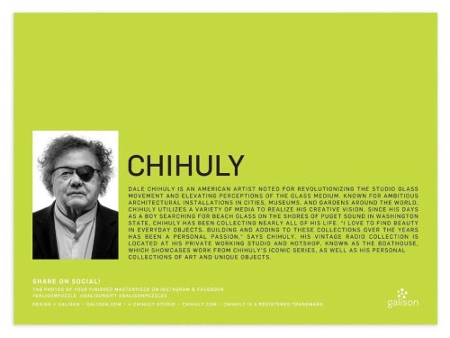 Od dob, kdy jako chlapec hledal plážové sklo na pobřeží Puget Sound ve státě Washington, umělec Dale Chihuly sbíral téměř celý svůj život přenosná rádia. Jeho sbírka starých rádií je vystavena v tomto novém krásném puzzle, které si může užít každý. Puzzle jsou baleny v pevných krabicích s matným povrchem. Hlavní vlastnosti: Obsahuje 1000 dílkůPotištěno netoxickými inkoustyPrémiová kvalita puzzleJednotlivé dílky do sebe přesně pasujíRozvíjí logické myšlení a motoriku