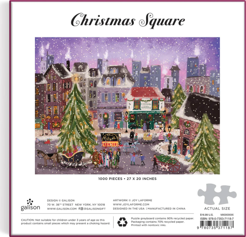 Vánoční puzzle od autorky Joy Laforme představuje půvabnou, zasněženou vánoční vesnici během prázdnin, doplněnou o rozsvícené vánoční stromky, koledníky, kouřící komíny a další. Puzzle je baleno v pevné krabici, pro opětovné použití a skladování. Ideální jako dárek. Autorem obrázku je Joy Laforme. Puzzle jsou vyrobeny za použití významného podílu recyklovaného papíru a nabízí špičkový potisk nezávadnými barvami. Jsou opatřeny matnou povrchovou úpravou, která zajišťuje za všech okolností věrné podání detailů i barev. Jejich zadní strana je potažena hladkým, na dotek příjemným povrchem, díky němuž se při skladování rozloženého puzzle netvoří prach. Spolu s pečlivě zabalenými dílky naleznete v balení také letáček s návodným obrázkem, který zpravidla obsahuje další informace o tvůrcích a pozadí vzniku díla. Dodáváno v mimořádně pevné a poutavě zpracované kartonové krabičce vyrobené z recyklovaného kartonu a udržitelně získaných materiálů s certifikací FSC®. Hlavní vlastnosti: 1000 precizně vyřezaných dílkůvyrobeno s použitím recyklovaných a udržitelně získaných materiálůpečlivě vybraný motiv od renomovaných tvůrců a umělcůpotisk a provedení nejvyšší kvalityobsahuje návodný obrázek