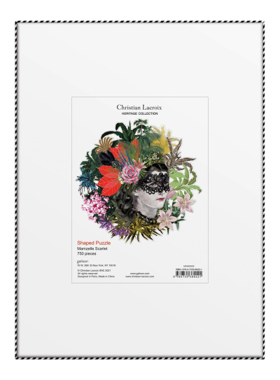 Tvarové puzzle nabízí větší zábavu při skládání. Dílky jsou speciálně tvarované a po dokončení skládačky se před vámi objeví Mam´zelle Scarlett. Motiv tohoto puzzle vytvořil známý designér Christian Lacroix. Součástí balení je barevná předloha. Puzzle Christian Lacroix je baleno v robustní dvojdílné krabičce, ideální pro darování, opětovné použití nebo skladování. Některé plochy na krabičce jsou opatřeny speciální lesklou úpravou. Rozměr složeného puzzle cca 53,5 x 72 cm