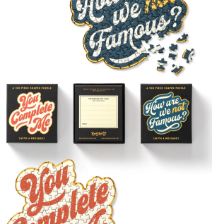 Tvarové puzzle v mini verzi You Complete Me je dokonalým způsobem jak netradičně předat Váš vzkaz. Na malé dárkové krabičce je místo, kam můžete svou vlastní myšlenku napsat. Rozměr složeného puzzle cca 18,5 x 17,4 cm
