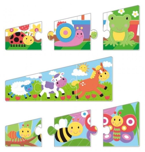 Sada šesti puzzle s legračními postavičkami zvířátek pro velmi malé děti. Každé puzzle se skládá ze tří dílků a pomůže při rozvíjení rozeznávání velikosti, protože zvířátka jsou seřazena podle velikosti. Ideální první puzzle obsahující méně dílků, které se rychle skládá. Přibližná velikost jednoho puzzle 10 x 24 cm. Vhodné pro děti od 18 měsíců. Rozměr složeného puzzle cca 10 x 24 cm