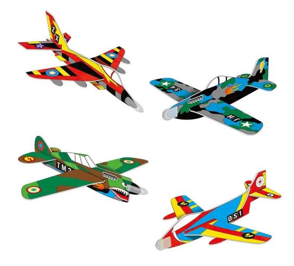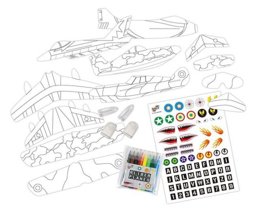 Přiloženými fixami vybarvi jednotlivé části letadel a poskládej je. Hotové letouny dozdob samolepkami a na špice nasaď závaží.