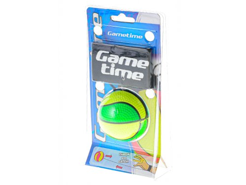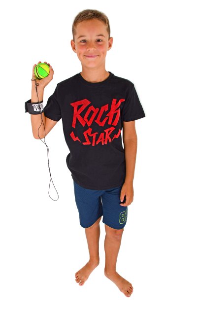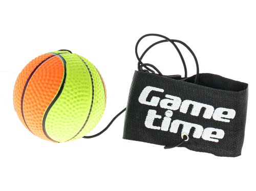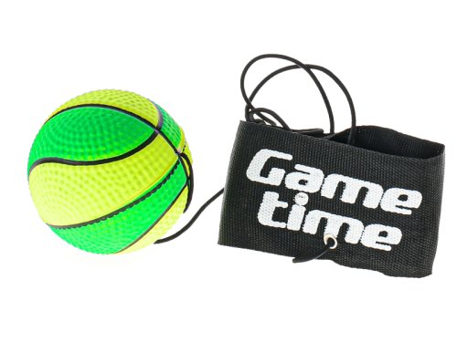 Míček o velikosti 6 cm na gumě je ve čtyřech barevných provedeních. Guma je našita na látkovém popruhu, který se zapíná na suchý zip a lze jej upevnit jak na ruku tak i na nohu. A trénink může začít.