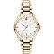 Dámské náramkové hodinky Napájení z baterie Strojek MIYOTA 2036 Průměr pouzdra 34,0 mm Pouzdro ve tvaru kruhu Ocelové pouzdro Zlatavá barva pouzdra Ocelový tah Zlatavá barva tahu Ručičkový ciferník Bílá barva ciferníku Ciferník s dvanácti indexy Materiál skla - minerální sklo Odolné proti vodě během sprchování a mytí