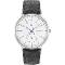 Pánské náramkové hodinky Napájení z baterie Strojek VD77 Průměr pouzdra 40,0 mm Pouzdro ve tvaru kruhu Ocelové pouzdro Stříbrná barva pouzdra Kožený tah Šedá barva tahu Ručičkový ciferník Bílá barva ciferníku Ciferník s dvanácti indexy Materiál skla - minerální sklo Odolné proti vodě při běžném nošení