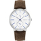Pánské náramkové hodinky Napájení z baterie Strojek VD77 Průměr pouzdra 40,0 mm Pouzdro ve tvaru kruhu Ocelové pouzdro Stříbrná barva pouzdra Kožený tah Hnědá barva tahu Ručičkový ciferník Bílá barva ciferníku Ciferník s dvanácti indexy Materiál skla - minerální sklo Odolné proti vodě při běžném nošení