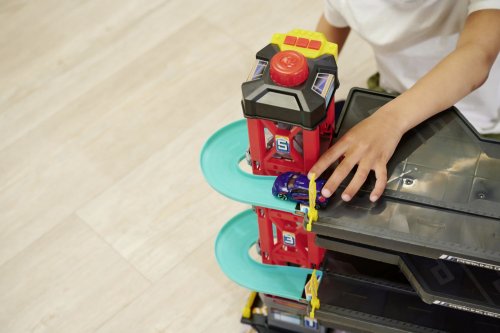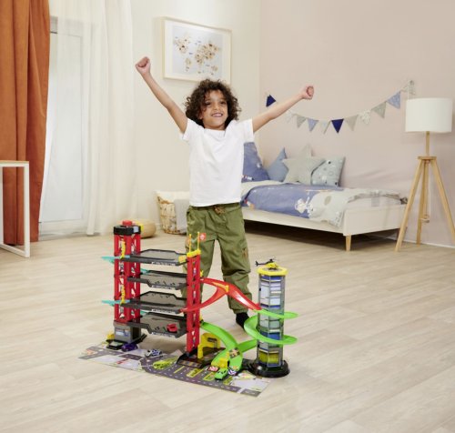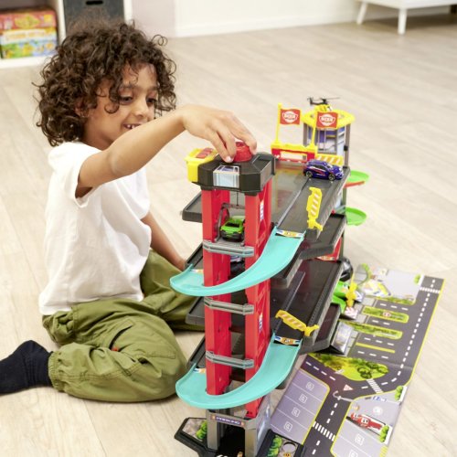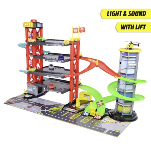 Parkovací garáž má 4 podlaží, dráhu, funkce zvuku i světel, manuální výtah. Součástí jsou 4 kovová autíčka, vrtulník a doplňky. Rozměry garáže: 81,5 x 22,5 x 52 cm.