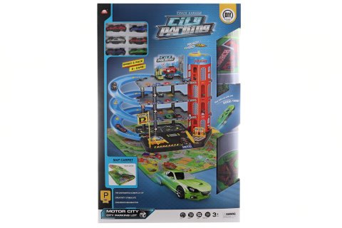 Velká plastová garáž. Balení také obsahuje 6 autíček a látkový koberec. Rozměr koberce 150x120 cm. Rozměry balení 50x78x9 cm. Věk 3+