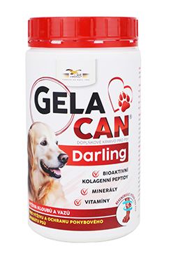 Kolagenní výživa kloubů s vitamíny. Doplňkové krmivo s vysokým obsahem kolagenních peptidů CHP, vitamínu E, selenu a základních minerálních látek potřebných pro správnou výživu a vývoj kostí a kloubů. Nově játrové aroma. Gelacan® Darling obsahuje kolagenní peptidy CHP, které vyživují a regenerují kloubní chrupavky, šlachy, vazy a kosti a zmírňují až odstraňují tak následky předchozí nedostatečné výživy nebo poškození kloubů, jejich deformaci, zabraňují dalšímu úbytku chrupavek, zlepšují hybnost a zmírňují bolestivost. Dále obsažené vitamíny, minerální látky a stopové prvky ve vyváženém poměru vhodně obohacují krmnou dávku. Optimální poměr účinných látek zvyšuje vitalitu psa, zlepšuje tělesnou kondici a urychluje regeneraci organismu. Vhodné podávat: