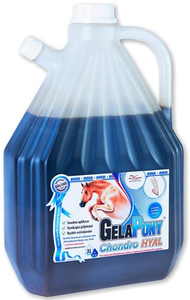 Gelapony® Chondro Hyal Biosol je doplňkové krmivo pro koně v zájmovém chovu, dostihové a sportovní - komplexní perorální chondronutraceutikum s bioaktivními kolagenními peptidy, glykosaminoglykany a kyselinou hyaluronovou k intenzivní výživě a regeneraci kloubního systému a pro zlepšení elasticko-mechanických vlastností kloubních a vazivových tkání při vysoké sportovní zátěži. Díky vysoce efektivní kombinaci účinných látek zvyšuje Gelapony® Chondro Hyal Biosol elasticitu kloubních chrupavek, vazů a šlach, obnovuje pohyblivost a omezuje bolestivost kloubů. Forma biosolu zajišťuje rychlé a snadné vstřebávání účinných látek a umožňuje snadnou aplikaci přípravku. Indikace:
