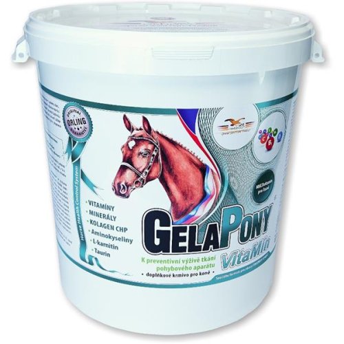 Bioaktivní kolagenní peptidy podporují u mladých koní správný růst a vývin kloubů, kostí, vazů a šlach. U dospělých koní chrání pohybový aparát před opotřebením v důsledku zvýšené fyzické zátěže či stáří. Vitamíny, minerální látky a aminokyseliny ve vyváženém poměru doplňují základní krmnou dávku. Optimální poměr účinných látek zvyšuje vitalitu koně, zlepšuje tělesnou kondici a urychluje regeneraci po zátěži. Vitamín E, selen a další antioxidanty obsažené v přípravku chrání tělní tkáně před škodlivým působením volných peroxidových radikálů, které ničí stěny buněk a způsobují jejich předčasné odumírání. L-cystin je zdrojem organické síry, která je potřebná pro správnou tvorbu kolagenu a tvorbu a kvalitu rohoviny kopyt a srsti. Kvalitu kopytní rohoviny rovněž pozitivně ovlivňují biotin, zinek a vitamín A. Vitamíny skupiny B mají pozitivní vliv především na nervovou soustavu koně a celkový metabolismus koně. L-lysin a L-arginin podporují správný vývoj a funkci kosterní svaloviny. Složení: syrovátka sušená, kolagen hydrolyzovaný (12 %), chlorid sodný, uhličitan vápenatý, chlorid draselný, oxid hořečnatý, skořice. Nutriční doplňkové látky na 1 kg: železo (Bioplex Fe – chelát železa a bílkovinných hydrolyzátů) 1 000 mg, zinek (Bioplex Zn – chelát zinku a bílkovinných hydrolyzátů) 1 170 mg, mangan (Bioplex Mn – chelát manganu a bílkovinných hydrolyzátů) 400 mg, měď (Bioplex Cu – chelát mědi a bílkovinných hydrolyzátů) 166 mg, jód (jodid draselný) 67 000 µg, selen (Sel-Plex – organická forma selenu, kterou produkují Saccharomyces cerevisiae CNCM I-3060, L-selenomethionin) 2 000 µg, vitamín C 3 000 mg, vitamín A 100 000 MJ, vitamín D3 100 000 MJ, vitamín E 2 000 mg, vitamín B1 1 000 mg, vitamín B2 400 mg, D-pantothenan vápenatý 200 mg, vitamín B6 150 mg, vitamín B12 1 000 µg, biotin 10 000 µg, kyselina listová 400 000 µg, L-karnitin 440 mg, L-cystin 500 mg, L-arginin 500 mg, L-lysin monohydrochlorid 500 mg. Složení v denní dávce 30 g: bioaktivní kolagenní peptidy 3 600 mg, vápník 330 mg, hořčík 150 mg, železo 30 mg, mangan 12 mg, měď 5 mg, zinek 35 mg, sodík 570 mg, draslík 252 mg, jód 2 mg, selen 60 µg, vitamín A 3 000 MJ, vitamín B1 30 mg, vitamín B2 12 mg, vitamín B5 6 mg, vitamín B6 4,5 mg, vitamín B12 30 µg, vitamín C 90 mg, vitamín D3 3000 MJ, vitamín E 60 mg, vitamín H-biotin 300 µg, kyselina listová 12 000 µg, L-karnitin 13 mg, L-cystin 15 mg, L-arginin 15 mg, L-lysin 15 mg. Krmný návod: Přípravek podávejte denně k doplnění potřeby vitamínů, stopových prvků a minerálních látek po dobu zvýšené sportovní zátěže či zvýšené potřeby v době růstu a reprodukce. Doporučujeme trvalé podávání jako součást běžné krmné dávky pro zdraví koní. Denní dávku odměřte a přimíchejte ke krmné dávce. Nejlépe se osvědčilo přimíchání do dávky jádra a lehké zvlhčení. Doporučené dávkování – kůň 30 g denně (cca 3 odměrky), hříbě/poník 15 g denně (cca 1,5 odměrky). „No Doping!“ – GelaPony VitaMín neobsahuje žádné látky považované za doping koní. Jeho podávání je neomezené v průběhu celé sportovní přípravy i během závodů. Skladování: Uchovávejte v uzavřeném obalu v suchu a při teplotě do 25 °C.