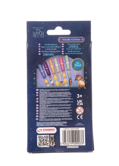 Gelová metalická pera v licenci Disney Wish. Balení obsahuje 6 ks gelových metalických per s různými motivy Disney – růžová, zlatá, stříbrná, fialová, modrá a zelená.