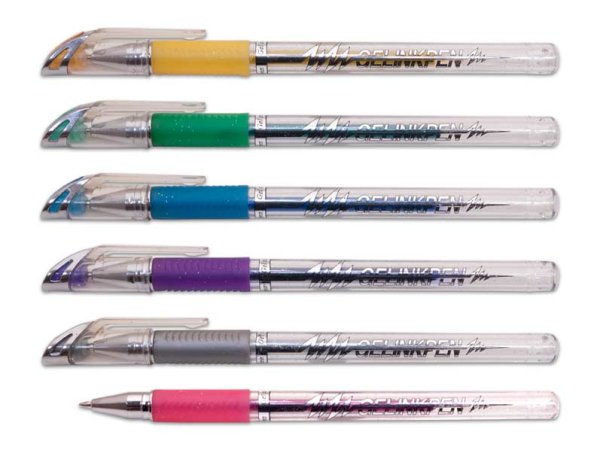 Set 6 ks gelových per v GLITTROVÝCH barvách s hrotem 1 mm. Vhodná pro školní, kancelářské, ale i domácí použití. Gelové pero má pogumovaný úchop, a tak zabraňuje klouzání v ruce. <br> <br> Délka: 150 mm<br> Provedení: s vrškem<br> Počet ks v balení: 6 ks<br> Barva: stříbrná, fialová, modrá, zelená, žlutá, růžová<br> <br> Výrobek je určen pro děti od 3 let