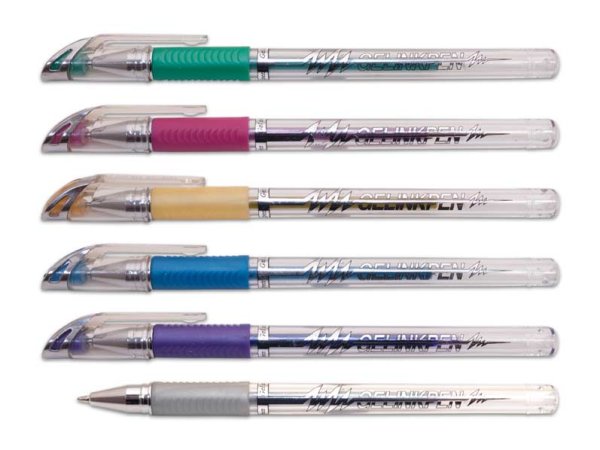 Set 6 ks gelových per v METALICKÝCH barvách s hrotem 1 mm. Vhodná pro školní, kancelářské, ale i domácí použití. Gelové pero má pogumovaný úchop, a tak zabraňuje klouzání v ruce. <br> <br> Délka: 150 mm<br> Provedení: s vrškem<br> Počet ks v balení: 6 ks<br> Barva: zelená, žlutá, modrá, růžová, fialová, stříbrná <br> <br> Výrobek je určen pro děti od 3 let