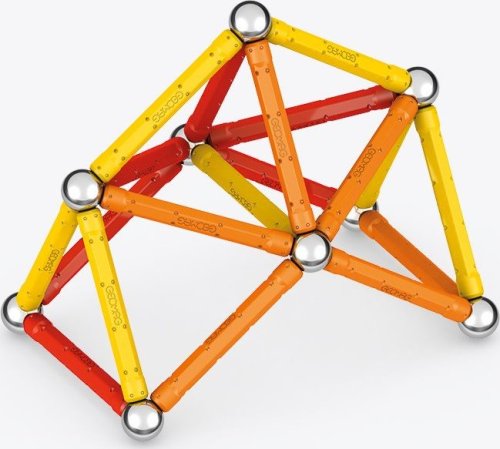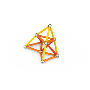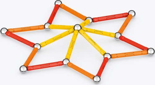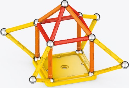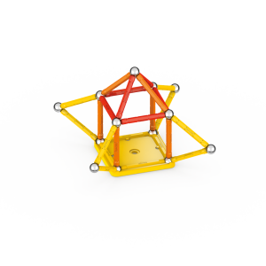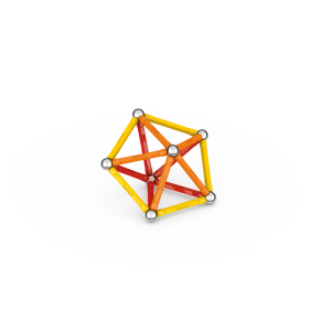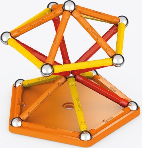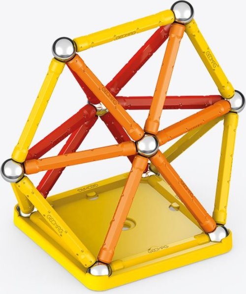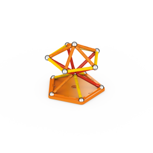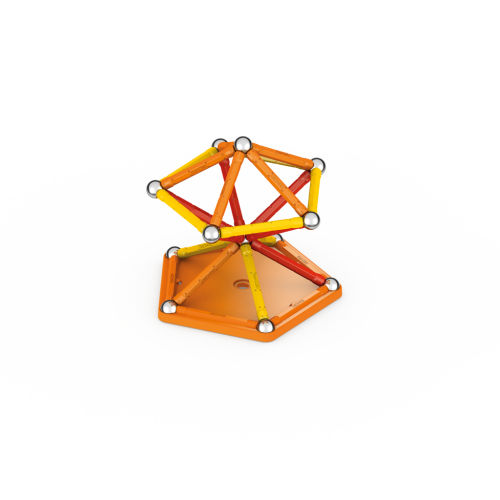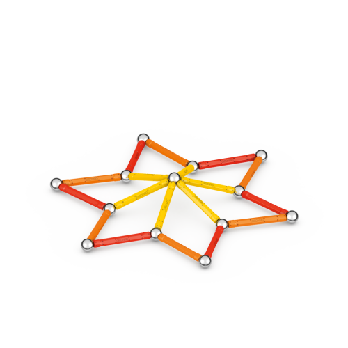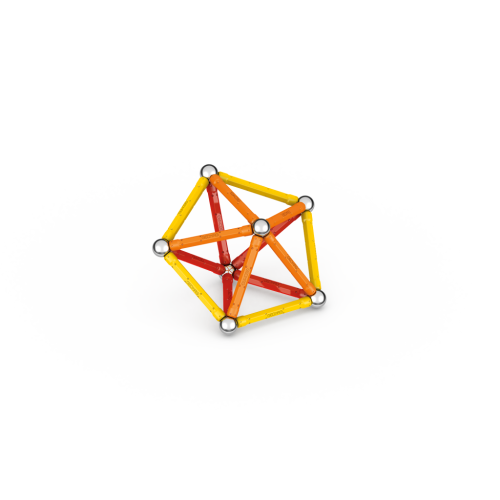Magnetická stavebnice GEOMAG Classic ze 100% recyklovatelného materiálu. Stavebnice obsahuje 20 magnetických tyček v kombinaci žluté, oranžové a červené barvy, 20 ocelových kuliček, 1 žlutý čtvercový a 1 oranžový pětiúhelníkový plastový podstavec. Celkem 42 dílků. Stavebnice je určena pro děti od 3 let. Vyrobeno ve Švýcarsku.