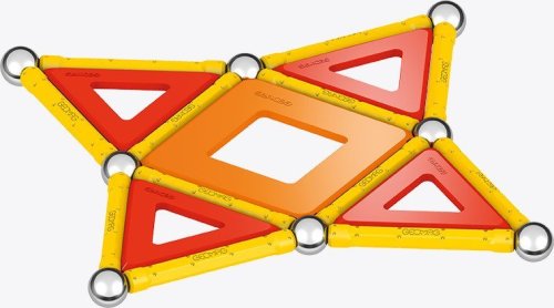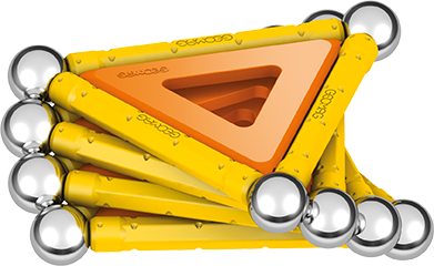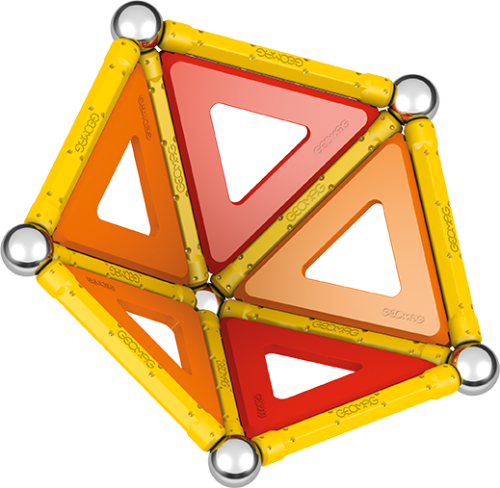 Magnetická stavebnice GEOMAG Classic Panels ze 100% recyklovatelného materiálu. Stavebnice obsahuje 12 žlutých magnetických tyček, 12 ocelových kuliček, 8 trojúhelníkových, 2 čtvercové a 1 pětiúhelníkovou plastovou výplň v kombinaci oranžové a červené barvy. Celkem 35 dílků. Stavebnice je určena pro děti od 5 let. Vyrobeno ve Švýcarsku.