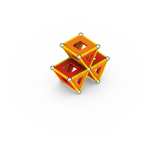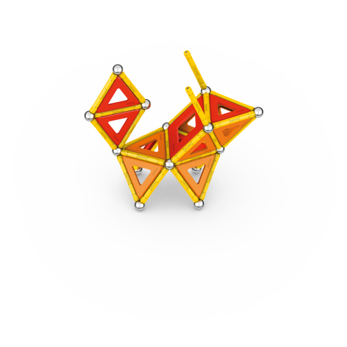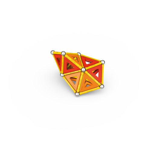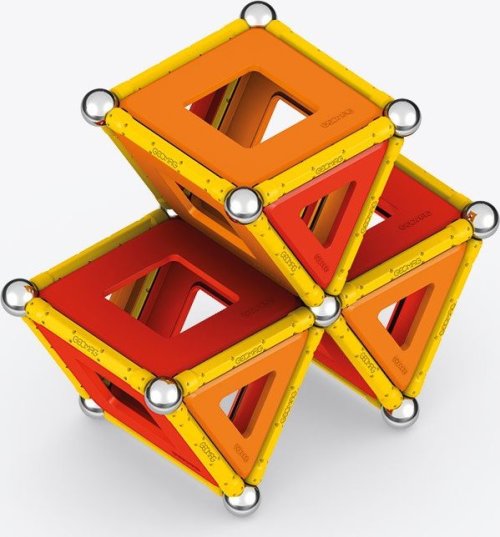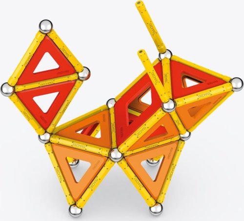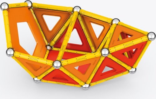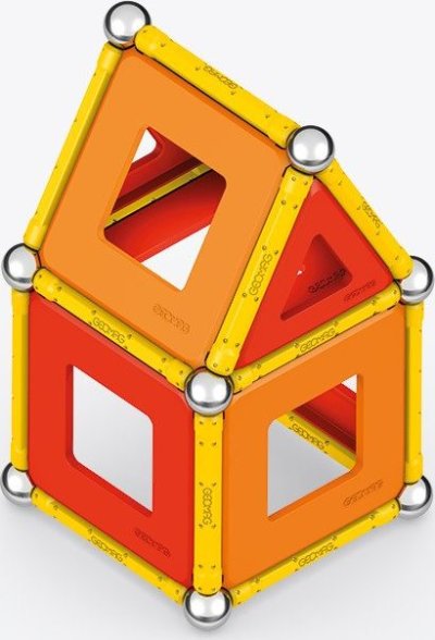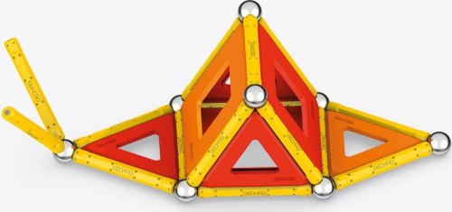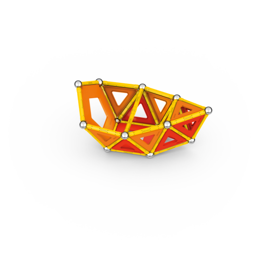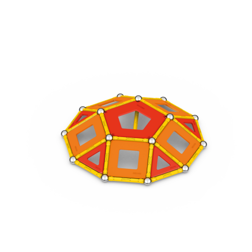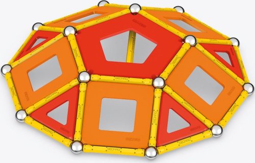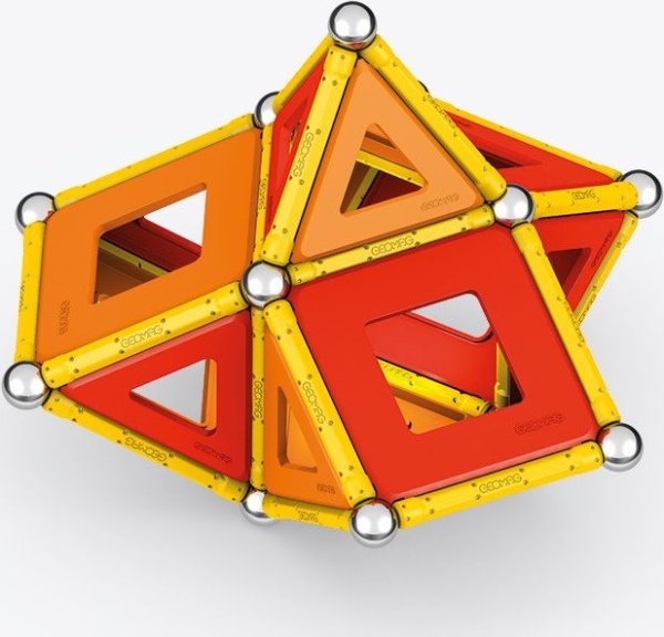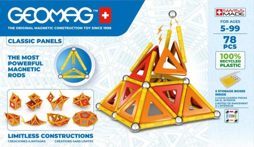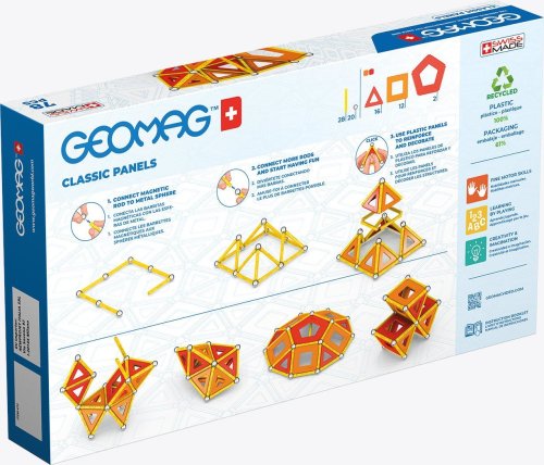 Geomag Classic Panels je magnetická stavebnice složená ze 78 dílků, která nabízí nekonečné možnosti kreativní stavby a rozvíjení prostorové představivosti. Sada obsahuje 28 žlutých magnetických tyček, 20 ocelových kuliček a plastové výplně v různých tvarech – konkrétně 16 trojúhelníkových, 12 čtvercových a 2 pětiúhelníkové panely, které jsou barevně laděné v odstínech oranžové a červené. Díky kombinaci těchto prvků lze vytvářet rozmanité geometrické tvary a struktury, což je demonstrováno na obalu i na přiložených modelech, kde jsou znázorněny různé trojrozměrné konstrukce včetně pyramid, domečků a dalších abstraktních tvarů.