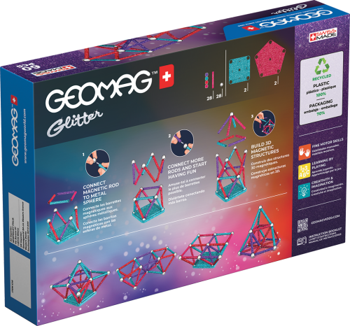 Geomag Glitter je tak nejen vzdělávací hračkou, ale také zábavným způsobem, jak rozvíjet kreativitu a motorické dovednosti dětí, a to s ohledem na udržitelnost materiálů a ekologický přístup. Díky své univerzálnosti a poutavému třpytivému designu se jedná o skvělý doplněk do sbírky stavebnic pro všechny věkové kategorie.