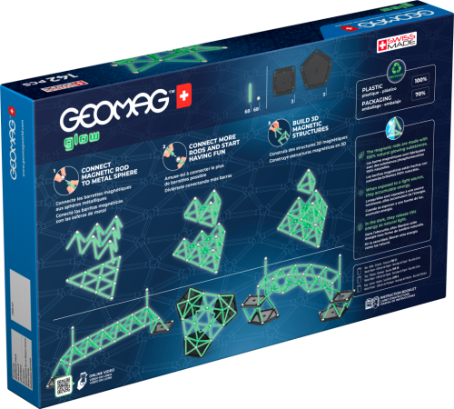 Unikátní magnetická stavebnice Geomag Glow. Obsahuje: 68 magnetických tyček 68 ocelových kuliček 3 čtvercové podstavce 3 pětiúhelníkové podstavce Vhodné od 3 let.