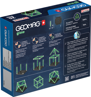 Balení je prakticky řešeno s úložným boxem uvnitř, který umožňuje snadné uskladnění všech dílků po skončení hry. Díky kompaktnímu designu a vysoce kvalitnímu zpracování je stavebnice určena jak pro děti od 3 let, tak i pro starší uživatele až do 99 let. Geomag Glow tak podporuje rozvoj kreativity, logického myšlení a jemné motoriky prostřednictvím zábavné a poutavé formy hry, která nabízí neomezené možnosti stavby různých geometrických tvarů a struktur.