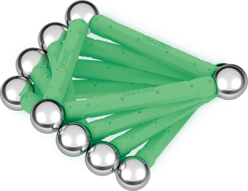 Tyčky jsou vyrobeny ze 100% recyklovaného plastu, což zajišťuje ekologický přístup k výrobě a zároveň kvalitní a odolný materiál. Svítící část tyček je výsledkem speciální fosforescenční úpravy, která umožňuje jejich přirozené nabíjení světlem a následné vyzařování v temnotě bez potřeby baterií. Díky tomu je hra bezpečná a šetrná k životnímu prostředí. Magnety uvnitř tyček a ocelové kuličky zajišťují pevné a stabilní spojení jednotlivých dílků během stavby.
