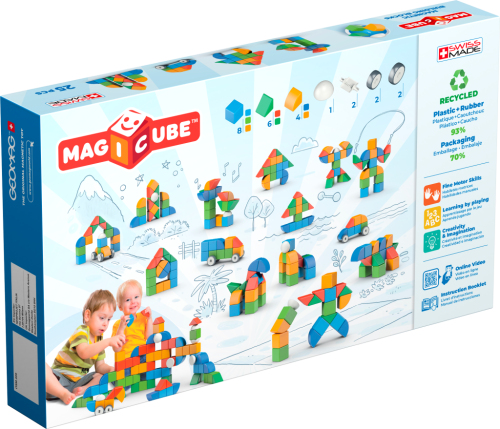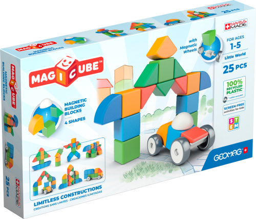 Geomag Magicube Shapes 25 dílků je stavebnice určená pro děti od jednoho roku, která nabízí široké možnosti kreativního tvoření díky magnetickým dílkům v různých tvarech a barvách. Sada obsahuje celkem 25 dílků, přičemž kromě klasických magnetických krychliček jsou zde také čtyři kolečka a další tři speciální tvary, které umožňují stavbu nejen statických modelů, ale i pohyblivých vozidel. Díky magnetickému spoji lze jednotlivé dílky snadno spojovat a přestavovat, což podporuje rozvoj jemné motoriky i představivosti.