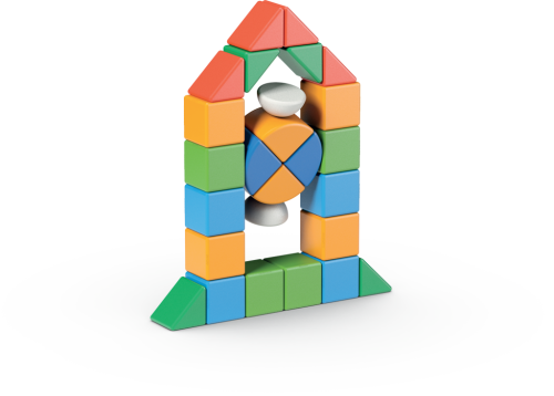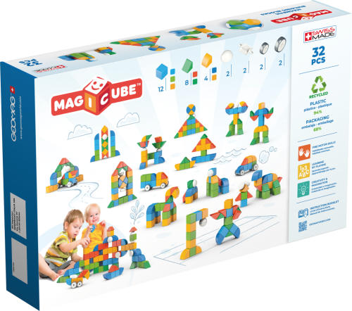 Kromě magnetických krychliček jsou součástí této sady také další tři magnetické tvary a čtyři kolečka. Obsahuje celkem 32 dílků. Vyrobeno ve Švýcarsku za použití recyklovaných plastů. Vhodné od 1 roku.