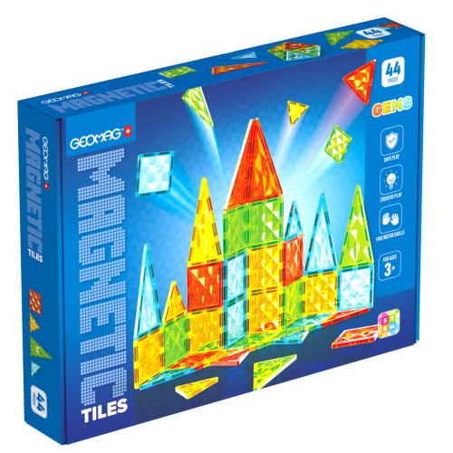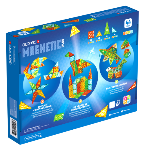 Geomag Magnetic Tiles 44 dílků je kreativní stavebnice, která nabízí 44 průhledných magnetických dílků ve čtyřech jasných barvách – červené, žluté, zelené a modré. Dílky mají různé tvary, které zahrnují 20 čtverců, 12 rovnostranných trojúhelníků, 8 rovnoramenných a 4 pravoúhlé trojúhelníky. Díky magnetům umístěným na všech stranách jednotlivých dílků je možné snadno vytvářet různé 2D obrazce, jako jsou hvězdy nebo geometrické vzory, ale také komplexní 3D struktury jako hrady, zvířata nebo jiné fantazijní objekty.
