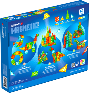 Geomag Magnetic Tiles 60 dílků představují stavebnici složenou z průhledných, strukturovaných magnetických dílků, které umožňují dětem snadno vytvářet jak 2D obrazce, tak i prostorové 3D konstrukce. Sada obsahuje přesně 60 dílků v jasných, atraktivních barvách – červené, zelené, žluté a modré – což dětem pomáhá nejen rozvíjet kreativitu, ale také učí rozpoznávat barvy a geometrické tvary. Díky magnetům umístěným po celém obvodu každého dílku lze jednotlivé kousky pevně a bezpečně spojovat, což podporuje manuální zručnost a prostorové vnímání.