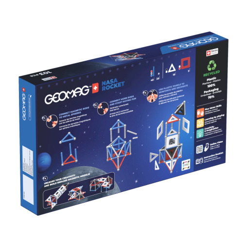 Limitovaná edice magnetických stavebnic Geomag ve spolupráci s Nasa. Sestavte si legendární kosmickou raketu, lunární modul nebo cokoliv jiného. Obsahuje celkem 103 dílků. Vyrobeno ve Švýcarsku, vhodné od 3 let.