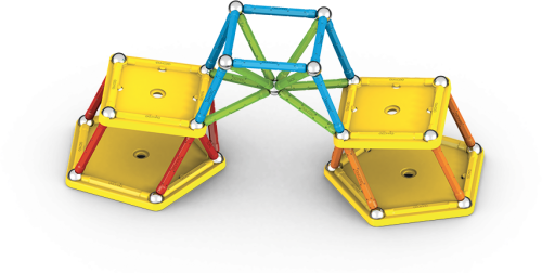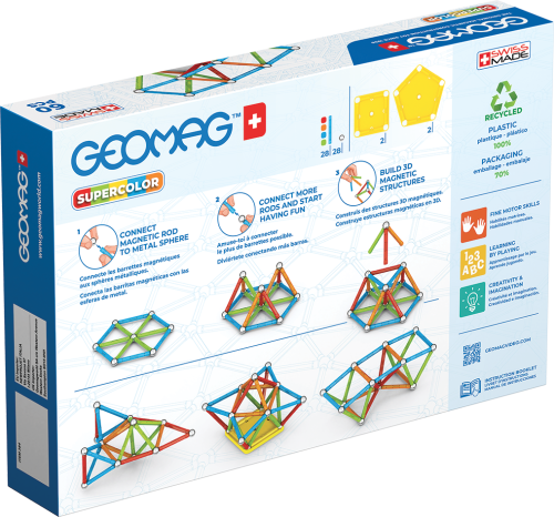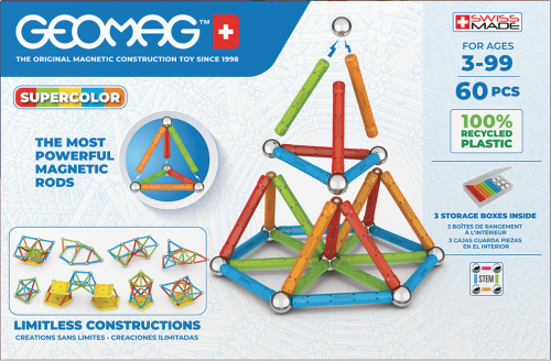 Všechny plasty použité pro potahy tyček a podstavců jsou ze 100% recyklovaného materiálu a jejich dokonalé barvy potěší i ty nejnáročnější. Součástí balení jsou navíc praktické transparentní úložné boxy, které jsou také vyrobeny z recyklovaného plastu. S nimi máte možnost mít stavebnici pořád u sebe a navíc přehledně srovnanou v kapesním balení. Stavebnice obsahuje 28 magnetických tyček různých barev, 28 ocelových kuliček, 2 pětiúhelníkové a 2 čtvercové plastové podstavce. Celkem 60 dílků. Stavebnice je vhodná pro děti od 3 let. Vyrobeno ve Švýcarsku.