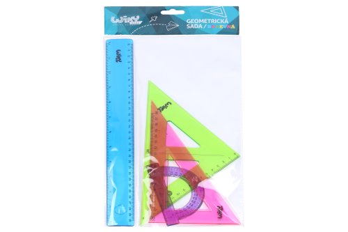 Geometrická sada - barevná • Rovné pravítko 30cm - modré • Úhloměr malý - fialový • 2x trojúhelník - růžový a zelený