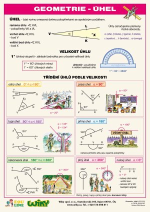 Naučná tabulka přináší přehledný souhrn učiva o úhlech.