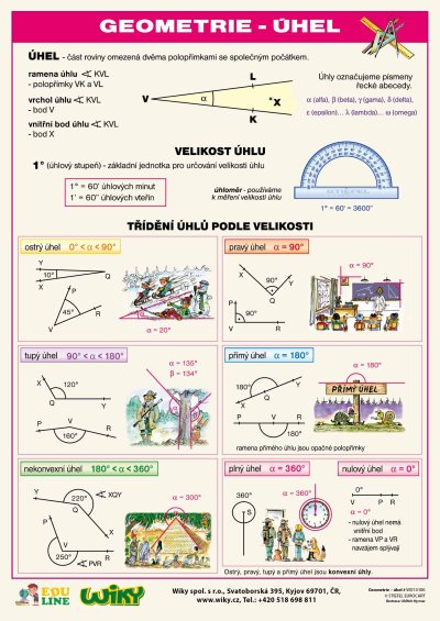 Přední stranu tvoří kromě úvodního vysvětlení základních pojmů – úhel, rameno, vrchol, vnitřní bod úhlu, velikost úhlu, stupeň, minuta, úhloměr – i přehledně ilustrovaná tabulka s tříděním úhlů podle velikosti.