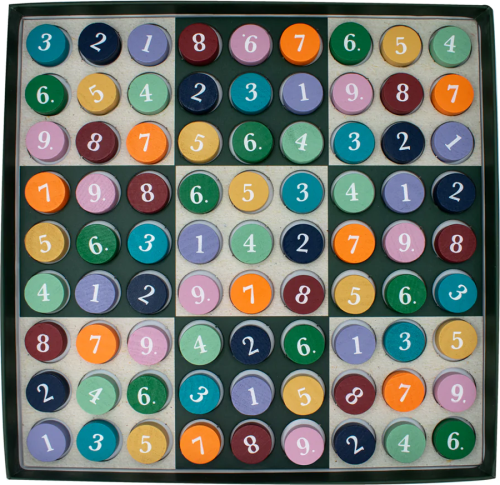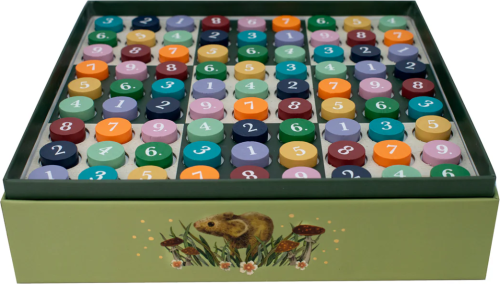 81 dřevěných hracích kamenů (9 kusů od každé barvy,čísla). Herní deska 9×9. Instrukce s úvodními zadáními.